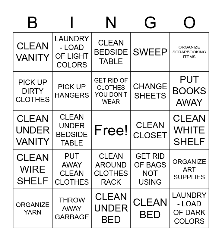This bingo card has a free space and 24 words: PUT AWAY CLEAN CLOTHES, THROW AWAY GARBAGE, GET RID OF CLOTHES YOU DON'T WEAR, ORGANIZE YARN, ORGANIZE SCRAPBOOKING ITEMS, CLEAN VANITY, PICK UP DIRTY CLOTHES, LAUNDRY - LOAD OF LIGHT COLORS, CLEAN CLOSET, CLEAN AROUND CLOTHES RACK, CHANGE SHEETS, CLEAN UNDER VANITY, GET RID OF BAGS NOT USING, ORGANIZE ART SUPPLIES, PICK UP HANGERS, CLEAN BED, CLEAN WHITE SHELF, CLEAN BEDSIDE TABLE, PUT BOOKS AWAY, CLEAN UNDER BEDSIDE TABLE, LAUNDRY - LOAD OF DARK COLORS, CLEAN WIRE SHELF, SWEEP and CLEAN UNDER BED.