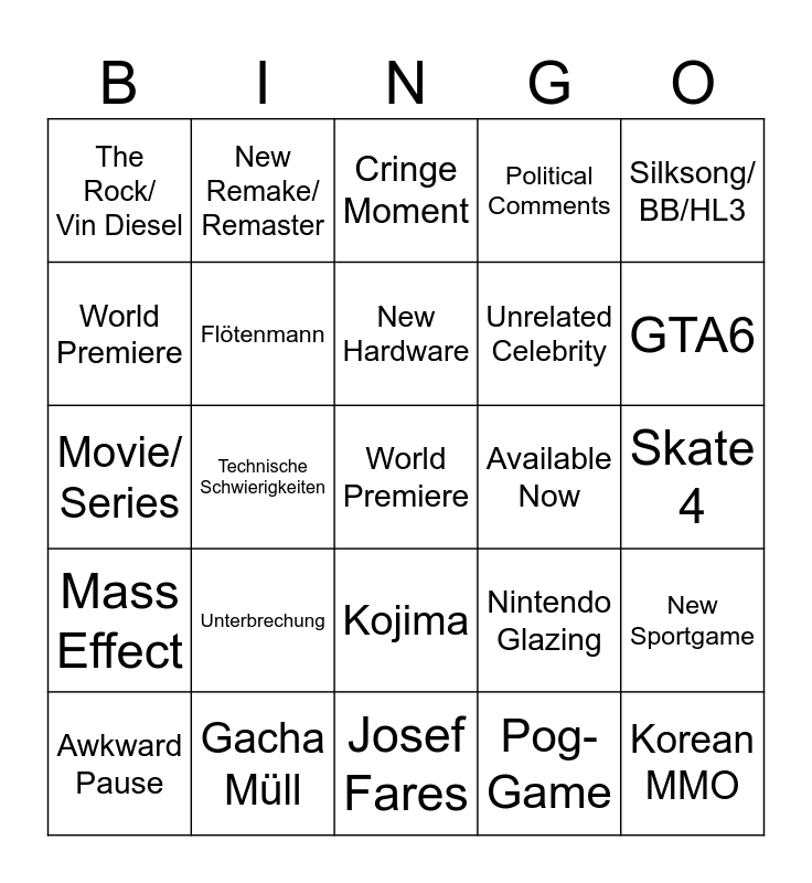 This bingo card has a free space and 24 words: Unterbrechung, Gacha Müll, New Hardware, Awkward Pause, Silksong/ BB/HL3, The Rock/ Vin Diesel, World Premiere, New Remake/ Remaster, Available Now, Kojima, Unrelated Celebrity, Movie/ Series, Nintendo Glazing, New Sportgame, Flötenmann, Pog-Game, Skate 4, Cringe Moment, GTA6, Technische Schwierigkeiten, Korean MMO, Mass Effect, Political Comments and Josef Fares.