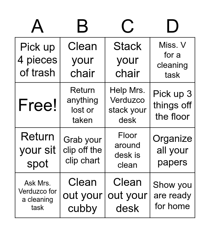 This bingo card has 16 words: Clean out your cubby, Organize all your papers, Stack your chair, Pick up 4 pieces of trash, Return your sit spot, Clean your chair, Floor around desk is clean, Clean out your desk, Free!, Return anything lost or taken, Ask Mrs. Verduzco for a cleaning task, Miss. V for a cleaning task, Grab your clip off the clip chart, Pick up 3 things off the floor, Help Mrs. Verduzco stack your desk and Show you are ready for home.