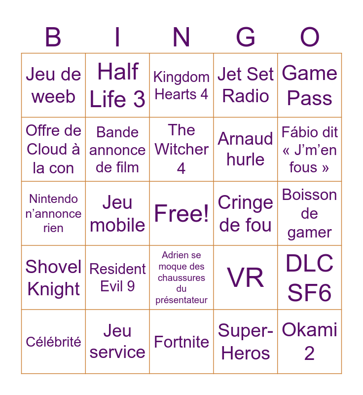 This bingo card has a free space and 24 words: Resident Evil 9, Jeu service, The Witcher 4, Célébrité, Game Pass, Jeu de weeb, Offre de Cloud à la con, Half Life 3, Cringe de fou, Adrien se moque des chaussures du présentateur, Arnaud hurle, Nintendo n’annonce rien, VR, DLC SF6, Bande annonce de film, Super-Heros, Boisson de gamer, Kingdom Hearts 4, Fábio dit « J’m’en fous », Jeu mobile, Okami 2, Shovel Knight, Jet Set Radio and Fortnite.