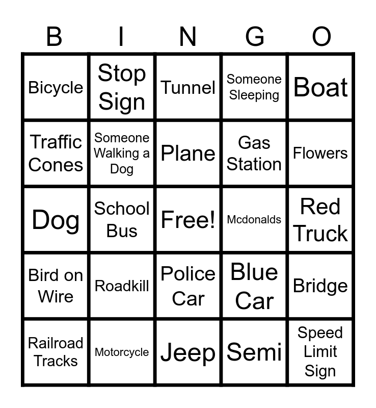 This bingo card has a free space and 24 words: Roadkill, Motorcycle, Plane, Railroad Tracks, Boat, Bicycle, Traffic Cones, Stop Sign, Mcdonalds, Police Car, Gas Station, Dog, Blue Car, Bridge, Someone Walking a Dog, Semi, Red Truck, Tunnel, Flowers, School Bus, Speed Limit Sign, Bird on Wire, Someone Sleeping and Jeep.