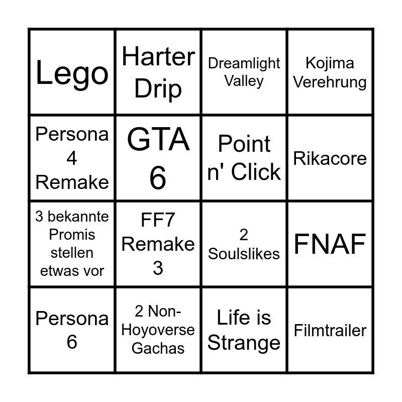 This bingo card has 16 words: 2 Non-Hoyoverse Gachas, FNAF, Dreamlight Valley, Lego, 3 bekannte Promis stellen etwas vor, Harter Drip, 2 Soulslikes, Life is Strange, Persona 4 Remake, GTA 6, Persona 6, Kojima Verehrung, FF7 Remake 3, Rikacore, Point n' Click and Filmtrailer.