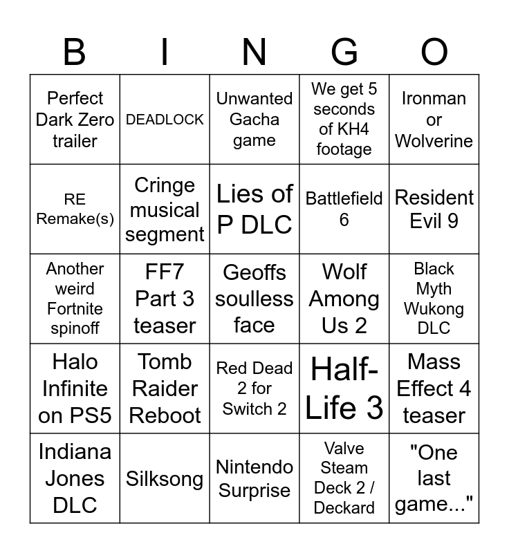 This bingo card has a free space and 24 words: Tomb Raider Reboot, Silksong, Lies of P DLC, Indiana Jones DLC, Ironman or Wolverine, Perfect Dark Zero trailer, RE Remake(s), DEADLOCK, Wolf Among Us 2, Red Dead 2 for Switch 2, Battlefield 6, Another weird Fortnite spinoff, Half-Life 3, Mass Effect 4 teaser, Cringe musical segment, Valve Steam Deck 2 / Deckard, Black Myth Wukong DLC, Unwanted Gacha game, Resident Evil 9, FF7 Part 3 teaser, "One last game...", Halo Infinite on PS5, We get 5 seconds of KH4 footage and Nintendo Surprise.