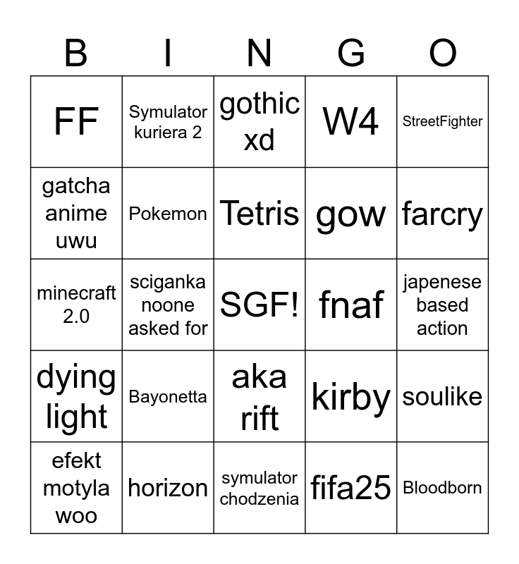 This bingo card has a free space and 24 words: Bayonetta, horizon, Tetris, efekt motyla woo, StreetFighter, FF, gatcha anime uwu, Symulator kuriera 2, fnaf, aka rift, gow, minecraft 2.0, kirby, soulike, Pokemon, fifa25, japenese based action, gothic xd, farcry, sciganka noone asked for, Bloodborn, dying light, W4 and symulator chodzenia.