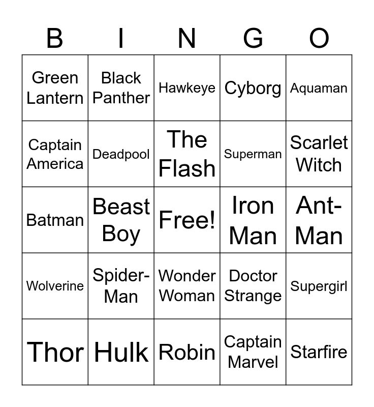 This bingo card has a free space and 24 words: Spider-Man, Hulk, The Flash, Thor, Aquaman, Green Lantern, Captain America, Black Panther, Iron Man, Wonder Woman, Superman, Batman, Doctor Strange, Supergirl, Deadpool, Captain Marvel, Ant-Man, Hawkeye, Scarlet Witch, Beast Boy, Starfire, Wolverine, Cyborg and Robin.