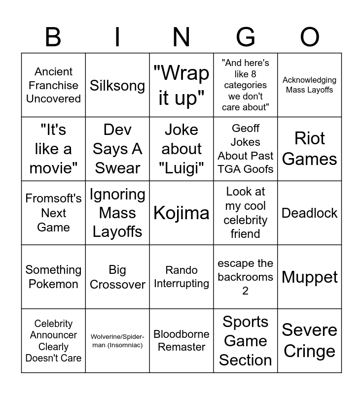 This bingo card has a free space and 24 words: Big Crossover, Wolverine/Spider-man (Insomniac), Joke about "Luigi", Celebrity Announcer Clearly Doesn't Care, Acknowledging Mass Layoffs, Ancient Franchise Uncovered, "It's like a movie", Silksong, Look at my cool celebrity friend, Rando Interrupting, Geoff Jokes About Past TGA Goofs, Fromsoft's Next Game, escape the backrooms 2, Muppet, Dev Says A Swear, Sports Game Section, Deadlock, "Wrap it up", Riot Games, Ignoring Mass Layoffs, Severe Cringe, Something Pokemon, "And here's like 8 categories we don't care about" and Bloodborne Remaster.