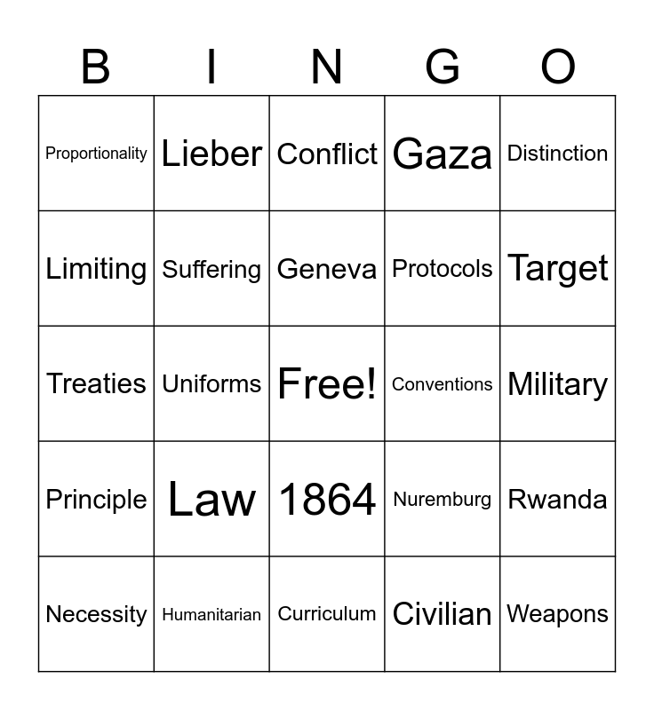 This bingo card has a free space and 24 words: Law, Humanitarian, Geneva, Necessity, Distinction, Proportionality, Limiting, Lieber, Conventions, 1864, Protocols, Treaties, Nuremburg, Rwanda, Suffering, Civilian, Military, Conflict, Target, Uniforms, Weapons, Principle, Gaza and Curriculum.