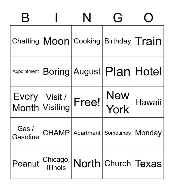 This bingo card has a free space and 29 words: Peanut, Museum, Visit / Visiting, Beach, Chatting, Cooking, Boring, CHAMP, New York, Chicago, Illinois, Hawaii, Texas, North, Church, Hotel, Roomate(s), Apartment, Gas / Gasoline, Train, Every Month, Sometimes, Arrive Early, Plan, Appointment, Birthday, Moon, Monday, August and Calendar.