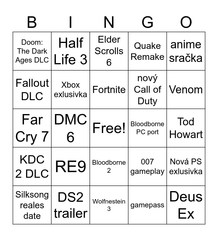 This bingo card has a free space and 24 words: RE9, DS2 trailer, Fortnite, Silksong reales date, anime sračka, Doom: The Dark Ages DLC, Fallout DLC, Half Life 3, Bloodborne PC port, Bloodborne 2, nový Call of Duty, Far Cry 7, 007 gameplay, Nová PS exlusivka, Xbox exlusivka, gamepass, Tod Howart, Elder Scrolls 6, Venom, DMC 6, Deus Ex, KDC 2 DLC, Quake Remake and Wolfnestein 3.