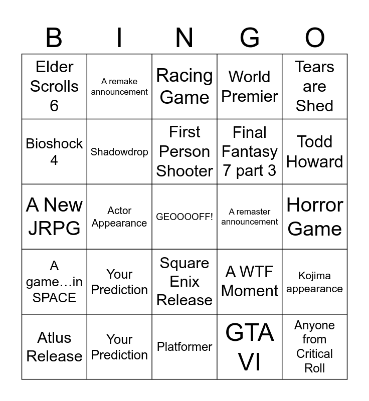 This bingo card has a free space and 24 words: Your Prediction, Your Prediction, First Person Shooter, Atlus Release, Tears are Shed, Elder Scrolls 6, Bioshock 4, A remake announcement, A remaster announcement, Square Enix Release, Final Fantasy 7 part 3, A New JRPG, A WTF Moment, Kojima appearance, Shadowdrop, GTA VI, Horror Game, Racing Game, Todd Howard, Actor Appearance, Anyone from Critical Roll, A game…in SPACE, World Premier and Platformer.