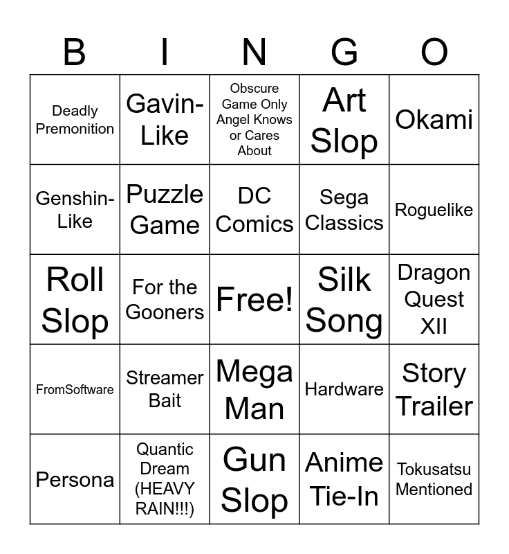 This bingo card has a free space and 24 words: Streamer Bait, Quantic Dream (HEAVY RAIN!!!), DC Comics, Persona, Okami, Deadly Premonition, Genshin-Like, Gavin-Like, Silk Song, Mega Man, Sega Classics, Roll Slop, Hardware, Story Trailer, Puzzle Game, Anime Tie-In, Dragon Quest XII, Obscure Game Only Angel Knows or Cares About, Roguelike, For the Gooners, Tokusatsu Mentioned, FromSoftware, Art Slop and Gun Slop.