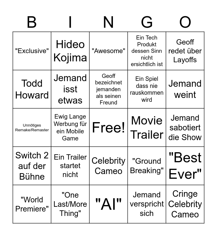 This bingo card has a free space and 24 words: Ein Trailer startet nicht, "One Last/More Thing", Geoff bezeichnet jemanden als seinen Freund, "World Premiere", Geoff redet über Layoffs, "Exclusive", Todd Howard, Hideo Kojima, Movie Trailer, Celebrity Cameo, Ein Spiel dass nie rauskommen wird, Unnötiges Remake/Remaster, "Ground Breaking", "Best Ever", Jemand isst etwas, Jemand verspricht sich, Jemand sabotiert die Show, "Awesome", Jemand weint, Ewig Lange Werbung für ein Mobile Game, Cringe Celebrity Cameo, Switch 2 auf der Bühne, Ein Tech Produkt dessen Sinn nicht ersichtlich ist and "AI".