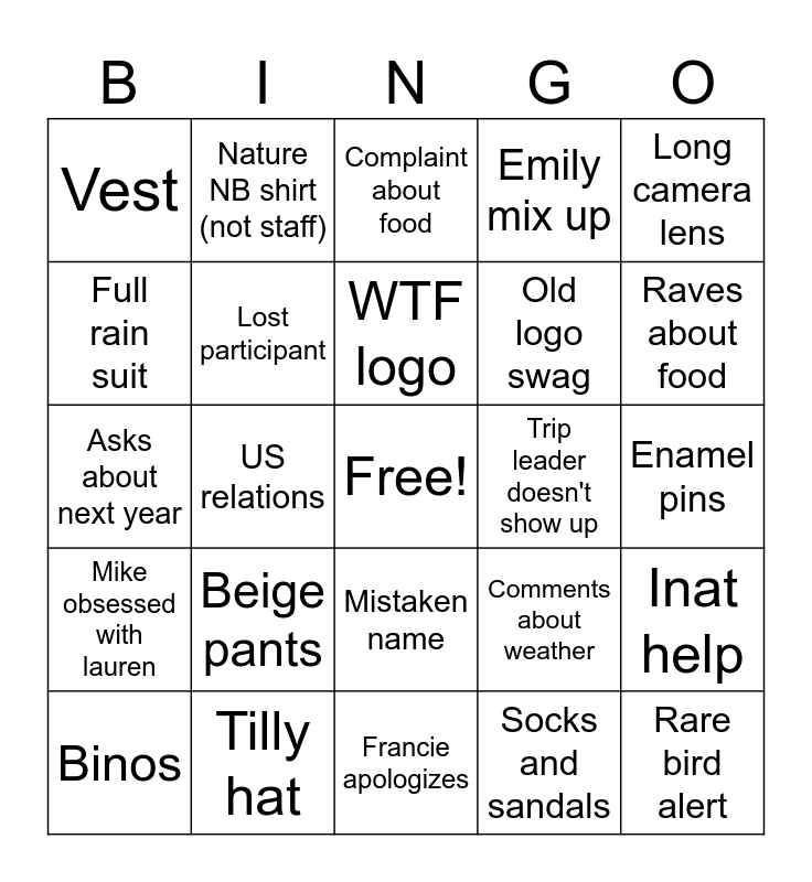 This bingo card has a free space and 24 words: Beige pants, Tilly hat, WTF logo, Binos, Long camera lens, Vest, Full rain suit, Nature NB shirt (not staff), Trip leader doesn't show up, Mistaken name, Old logo swag, Asks about next year, Comments about weather, Inat help, Lost participant, Socks and sandals, Enamel pins, Complaint about food, Raves about food, US relations, Rare bird alert, Mike obsessed with lauren, Emily mix up and Francie apologizes.