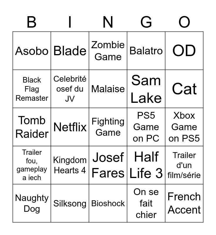This bingo card has 25 words: Kingdom Hearts 4, Bioshock, Malaise, Naughty Dog, OD, Asobo, Black Flag Remaster, Blade, PS5 Game on PC, Josef Fares, Sam Lake, Tomb Raider, Half Life 3, Trailer d'un film/série, Celebrité osef du JV, French Accent, Xbox Game on PS5, Zombie Game, Cat, Netflix, Fighting Game, Silksong, Trailer fou, gameplay a iech, Balatro and On se fait chier.