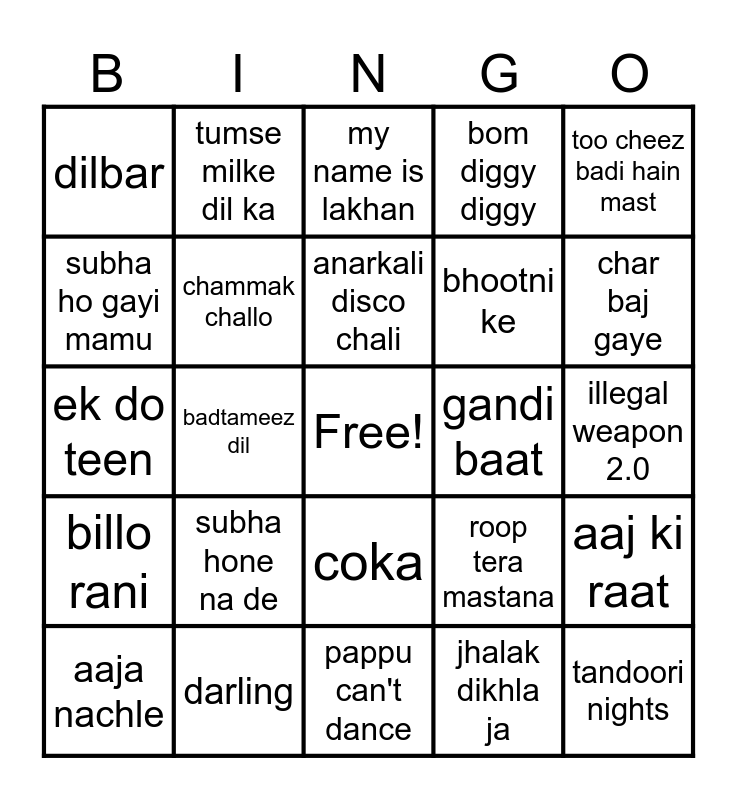This bingo card has a free space and 97 words: zor ka jhatka, golmaal, dilliwaali girlfriend, badtameez dil, disco deewane, radha, sheila ki jawani, bang bang, beedi jalaile, munni badname, afghan jalebi, ghagra, kajra re, billo rani, ishq kameena, dilbar, too cheez badi hain mast, crazy kiya re, dard-e-disco, chhaliya, bebo, lovely, aapka kya hoga, chaiyya chaiyya, fevicol se, anarkali disco chali, aaja nachle, aaj ki raat, dum maro dum, sadi gali, chammak challo, bom diggy diggy, hookah bar, ainvayi ainvayi, pappu can't dance, coka, daru badnaam, mauja he mauja, badri ki dulhania, ek do teen, ghungroo, illegal weapon 2.0, yaad piya ki aane lagi, jhalak dikhla ja, subha hone na de, desi girl, aankh marey, o saki saki, naacho naacho, hawa hawa, chittiyaan kaliyaan, baby doll, where's the party tonight, chaleya, kiya kiya, cutiepie, blue hai paani paani, tumse milke dil ka, kar gayi chull, o o jaane jaana, senorita, chale jaise hawaien, soni de nakhre, lungi dance, jeene ke hai chaar din, do u wanna partner, mujhse shaadi karogi, aal izz well, pungi, darling, bhootni ke, jalebi bai, dhan te nannn, hoth rasiley, bhaag D.K. bose, tinku jiya, just chill chill, balma, gandi baat, aa re pritam pyare, dil mein baji guitar, char baj gaye, dhinka chika, drama queen, main toh raste se ja raha tha, chaar botal vodka, tandoori nights, dil dooba, ek garam chai ki pyali, my name is anthony gonsalves, my name is lakhan, khaike paan banaras wala, are diwano mujhe pehchano, roop tera mastana, subha ho gayi mamu, barso re and aunty ji.