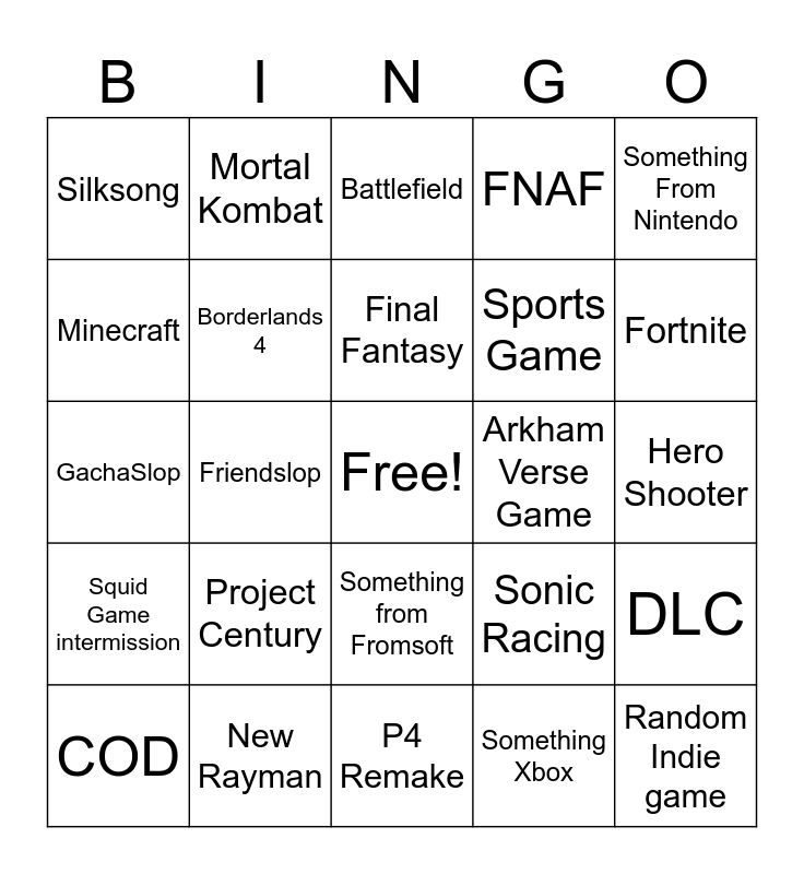 This bingo card has a free space and 24 words: Project Century, New Rayman, Final Fantasy, COD, Something From Nintendo, Silksong, Minecraft, Mortal Kombat, Arkham Verse Game, Something from Fromsoft, Sports Game, GachaSlop, Sonic Racing, DLC, Borderlands 4, Something Xbox, Hero Shooter, Battlefield, Fortnite, Friendslop, Random Indie game, Squid Game intermission, FNAF and P4 Remake.