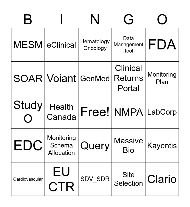 This bingo card has a free space and 29 words: IRT, EU CTR, Hematology Oncology, Rare Disease, FDA, MESM, Voiant, GenMed, NMPA, Kayentis, Cardiovascular, Health Canada, Site Selection, Clario, Study O, OOT (Dom Dashboard), SDV_SDR, Massive Bio, Monitoring Plan, EDC, Monitoring Schema Allocation, Equipment, Clinical Returns Portal, LabCorp, SOAR, eClinical, Query, Data Management Tool and CAP Report.