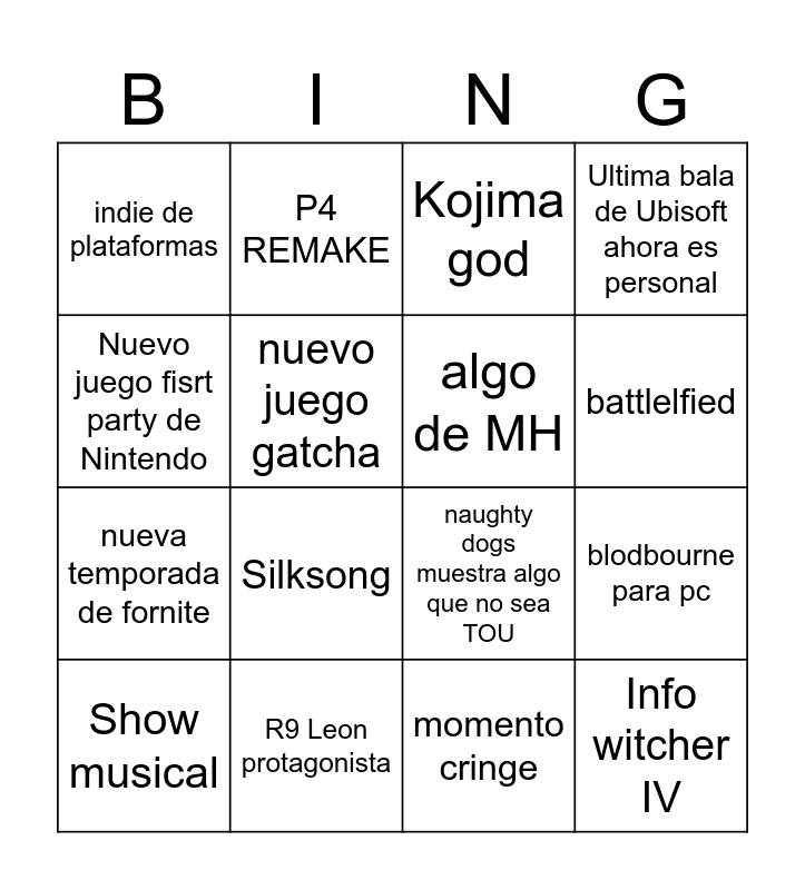 This bingo card has 16 words: R9 Leon protagonista, blodbourne para pc, Kojima god, indie de plataformas, nueva temporada de fornite, P4 REMAKE, naughty dogs muestra algo que no sea TOU, momento cringe, Nuevo juego fisrt party de Nintendo, nuevo juego gatcha, Show musical, Ultima bala de Ubisoft ahora es personal, Silksong, battlelfied, algo de MH and Info witcher IV.