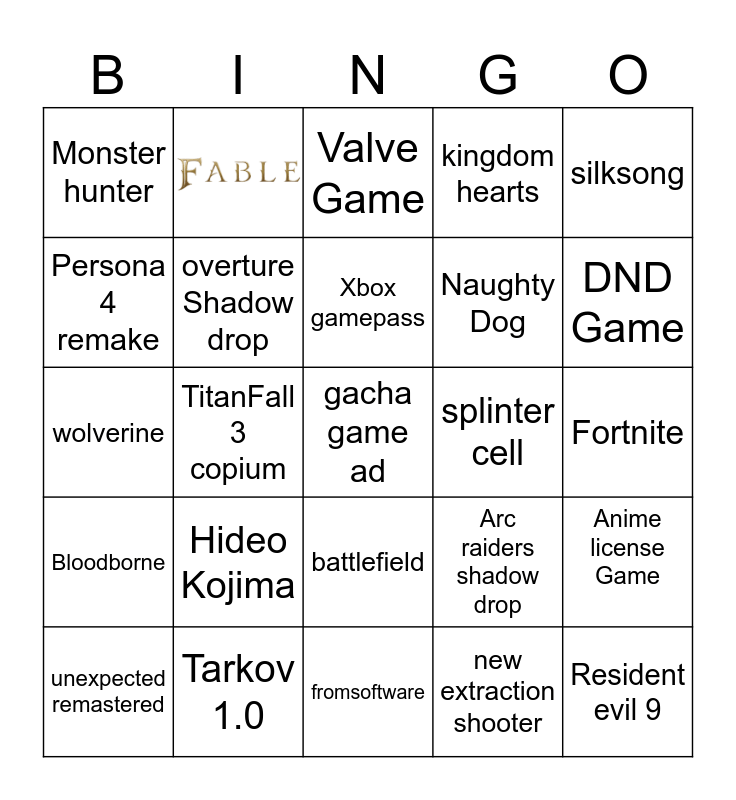 This bingo card has 1 images, a free space and 23 words: Hideo Kojima, Tarkov 1.0, Xbox gamepass, unexpected remastered, silksong, Monster hunter, Persona 4 remake, splinter cell, battlefield, Naughty Dog, wolverine, Arc raiders shadow drop, Anime license Game, overture Shadow drop, new extraction shooter, Fortnite, Valve Game, DND Game, TitanFall 3 copium, Resident evil 9, Bloodborne, kingdom hearts and fromsoftware.