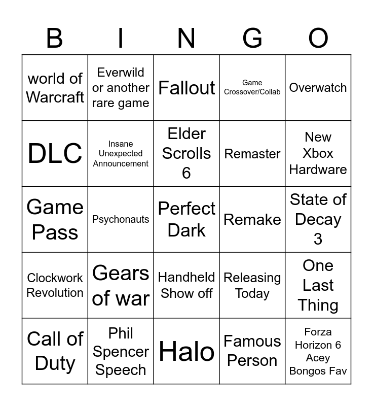 This bingo card has 25 words: Gears of war, Halo, Elder Scrolls 6, Call of Duty, Overwatch, world of Warcraft, DLC, Everwild or another rare game, Remake, Handheld Show off, Remaster, Game Pass, Releasing Today, One Last Thing, Insane Unexpected Announcement, Forza Horizon 6 Acey Bongos Fav, State of Decay 3, Fallout, New Xbox Hardware, Psychonauts, Perfect Dark, Phil Spencer Speech, Clockwork Revolution, Game Crossover/Collab and Famous Person.
