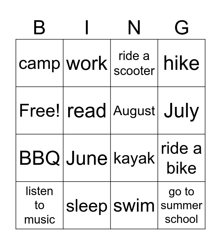 This bingo card has 16 words: sleep, ride a bike, ride a scooter, camp, BBQ, work, kayak, swim, Free!, read, listen to music, hike, June, July, August and go to summer school.