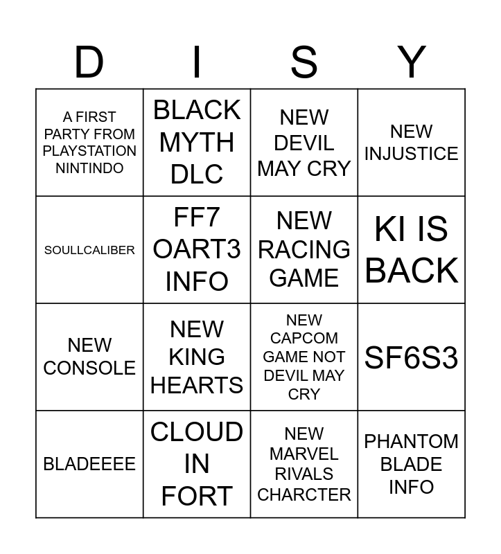 This bingo card has 16 words: CLOUD IN FORT, SF6S3, NEW DEVIL MAY CRY, A FIRST PARTY FROM PLAYSTATION NINTINDO, NEW CONSOLE, BLACK MYTH DLC, NEW CAPCOM GAME NOT DEVIL MAY CRY, NEW MARVEL RIVALS CHARCTER, SOULLCALIBER, FF7 OART3 INFO, BLADEEEE, NEW INJUSTICE, NEW KING HEARTS, KI IS BACK, NEW RACING GAME and PHANTOM BLADE INFO.