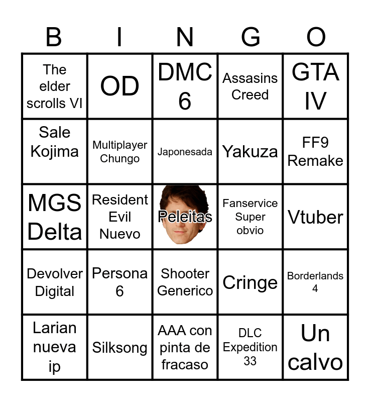 This bingo card has a free space and 24 words: Persona 6, Silksong, Japonesada, Larian nueva ip, GTA IV, The elder scrolls VI, Sale Kojima, OD, Fanservice Super obvio, Shooter Generico, Yakuza, MGS Delta, Cringe, Borderlands 4, Multiplayer Chungo, DLC Expedition 33, Vtuber, DMC 6, FF9 Remake, Resident Evil Nuevo, Un calvo, Devolver Digital, Assasins Creed and AAA con pinta de fracaso.
