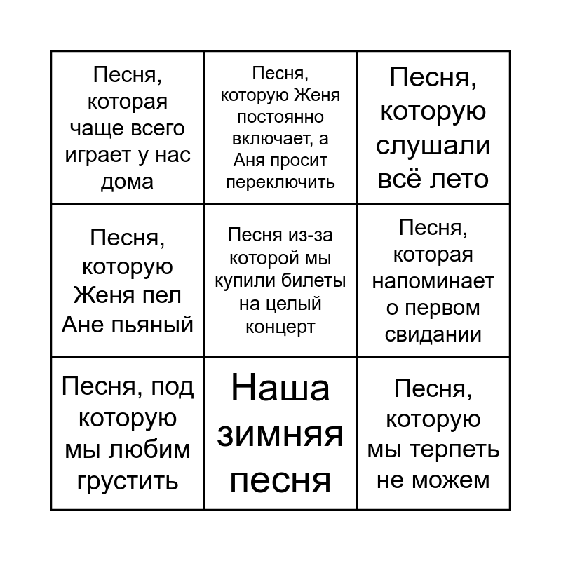 This bingo card has 20 words: Free!, Песня под которую впервые поцеловались, Песня, которую слушали всё лето, Песня, которая ассоциируется у жениха с невестой, Песня, которая ассоциируется у невесты с женихом, Песня из-за которой мы купили билеты на целый концерт, Песня, которую любим слушать на домашних тусовках, Песня, которая чаще всего играет у нас дома, Песня, которую мы терпеть не можем, Песня, которую Женя постоянно включает, а Аня просит переключить, Песня, которая нас вдохновляет, Песня, которую любит Аня, а Женя нет, Песня, которая напоминает о первом свидании, Песня, под которую было сделано предложения, Песня, под которую мы любим грустить, Аня Жене поёт в машине, Наша зимняя песня, Песня, которую Женя пел Ане пьяный, Первая песня, которую Аня пела Жене в караоке and Песня из первого совместного рилса.