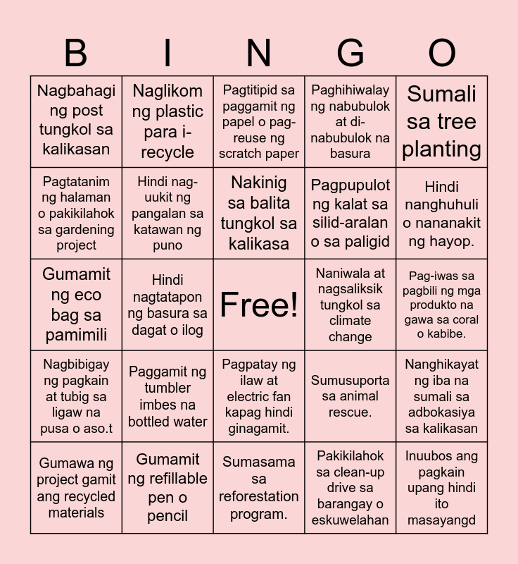 This bingo card has a free space and 24 words: Paggamit ng tumbler imbes na bottled water, Gumamit ng refillable pen o pencil, Nakinig sa balita tungkol sa kalikasa, Gumawa ng project gamit ang recycled materials, Sumali sa tree planting, Nagbahagi ng post tungkol sa kalikasan, Pagtatanim ng halaman o pakikilahok sa gardening project, Naglikom ng plastic para i-recycle, Naniwala at nagsaliksik tungkol sa climate change, Pagpatay ng ilaw at electric fan kapag hindi ginagamit., Pagpupulot ng kalat sa silid-aralan o sa paligid, Gumamit ng eco bag sa pamimili, Sumusuporta sa animal rescue., Nanghikayat ng iba na sumali sa adbokasiya sa kalikasan, Hindi nag-uukit ng pangalan sa katawan ng puno, Pakikilahok sa clean-up drive sa barangay o eskuwelahan, Pag-iwas sa pagbili ng mga produkto na gawa sa coral o kabibe., Pagtitipid sa paggamit ng papel o pag-reuse ng scratch paper, Hindi nanghuhuli o nananakit ng hayop., Hindi nagtatapon ng basura sa dagat o ilog, Inuubos ang pagkain upang hindi ito masayangd, Nagbibigay ng pagkain at tubig sa ligaw na pusa o aso.t, Paghihiwalay ng nabubulok at di-nabubulok na basura and Sumasama sa reforestation program..
