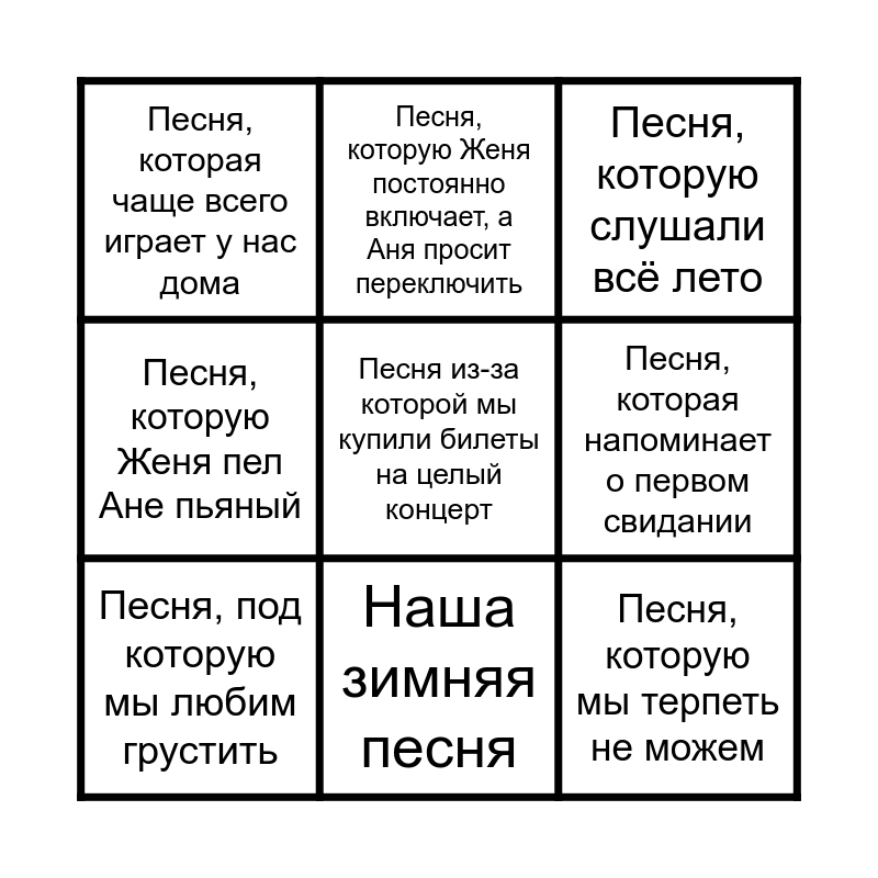 This bingo card has 20 words: Free!, Песня под которую впервые поцеловались, Песня, которую слушали всё лето, Песня, которая ассоциируется у жениха с невестой, Песня, которая ассоциируется у невесты с женихом, Песня из-за которой мы купили билеты на целый концерт, Песня, которую любим слушать на домашних тусовках, Песня, которая чаще всего играет у нас дома, Песня, которую мы терпеть не можем, Песня, которую Женя постоянно включает, а Аня просит переключить, Песня, которая нас вдохновляет, Песня, которую любит Аня, а Женя нет, Песня, которая напоминает о первом свидании, Песня, под которую было сделано предложения, Песня, под которую мы любим грустить, Аня Жене поёт в машине, Наша зимняя песня, Песня, которую Женя пел Ане пьяный, Первая песня, которую Аня пела Жене в караоке and Песня из первого совместного рилса.