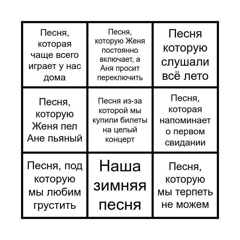 This bingo card has 20 words: Free!, Песня под которую впервые поцеловались, Песня которую слушали всё лето, Песня, которая ассоциируется у жениха с невестой, Песня, которая ассоциируется у невесты с женихом, Песня из-за которой мы купили билеты на целый концерт, Песня, которую любим слушать на домашних тусовках, Песня, которая чаще всего играет у нас дома, Песня, которую мы терпеть не можем, Песня, которую Женя постоянно включает, а Аня просит переключить, Песня, которая нас вдохновляет, Песня, которую любит Аня, а Женя нет, Песня, которая напоминает о первом свидании, Песня, под которую было сделано предложения, Песня, под которую мы любим грустить, Аня Жене поёт в машине, Наша зимняя песня, Песня, которую Женя пел Ане пьяный, Первая песня, которую Аня пела Жене в караоке and Песня из первого совместного рилса.