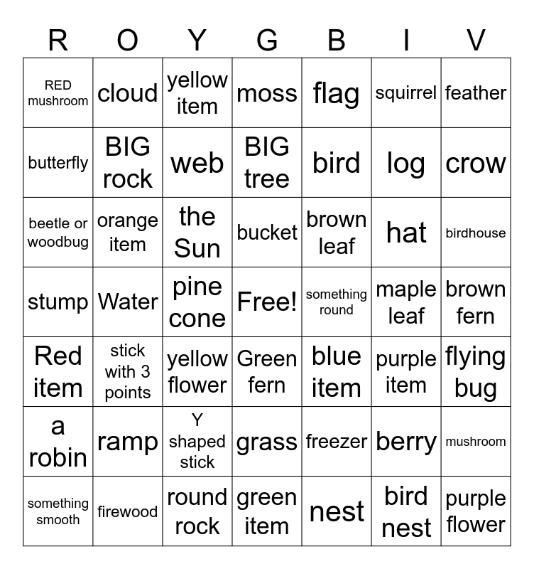 This bingo card has a free space and 48 words: Red item, Water, round rock, Green fern, bird, maple leaf, feather, something smooth, orange item, pine cone, moss, flag, hat, birdhouse, stump, ramp, yellow item, bucket, freezer, squirrel, crow, butterfly, cloud, web, nest, log, brown fern, a robin, stick with 3 points, the Sun, grass, brown leaf, berry, mushroom, RED mushroom, firewood, yellow flower, green item, something round, bird nest, flying bug, beetle or woodbug, BIG rock, Y shaped stick, BIG tree, blue item, purple item and purple flower.