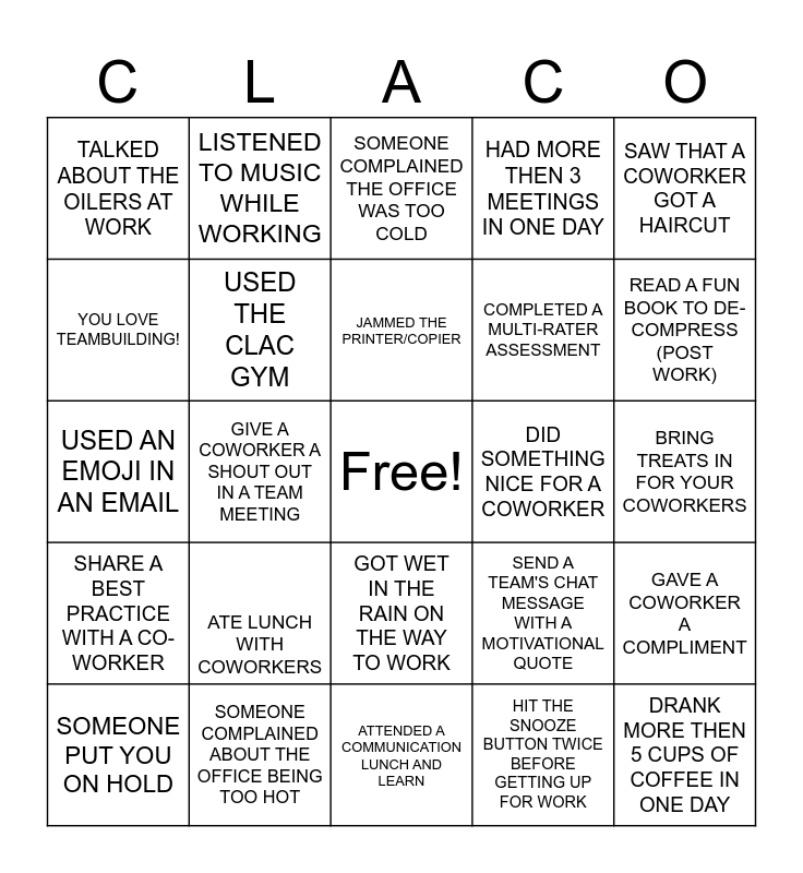 This bingo card has a free space and 24 words: ATE LUNCH WITH COWORKERS, SOMEONE COMPLAINED ABOUT THE OFFICE BEING TOO HOT, JAMMED THE PRINTER/COPIER, SOMEONE PUT YOU ON HOLD, SAW THAT A COWORKER GOT A HAIRCUT, TALKED ABOUT THE OILERS AT WORK, YOU LOVE TEAMBUILDING!, LISTENED TO MUSIC WHILE WORKING, DID SOMETHING NICE FOR A COWORKER, GOT WET IN THE RAIN ON THE WAY TO WORK, COMPLETED A MULTI-RATER ASSESSMENT, USED AN EMOJI IN AN EMAIL, SEND A TEAM'S CHAT MESSAGE WITH A MOTIVATIONAL QUOTE, GAVE A COWORKER A COMPLIMENT, USED THE CLAC GYM, HIT THE SNOOZE BUTTON TWICE BEFORE GETTING UP FOR WORK, BRING TREATS IN FOR YOUR COWORKERS, SOMEONE COMPLAINED THE OFFICE WAS TOO COLD, READ A FUN BOOK TO DE-COMPRESS (POST WORK), GIVE A COWORKER A SHOUT OUT IN A TEAM MEETING, DRANK MORE THEN 5 CUPS OF COFFEE IN ONE DAY, SHARE A BEST PRACTICE WITH A CO-WORKER, HAD MORE THEN 3 MEETINGS IN ONE DAY and ATTENDED A COMMUNICATION LUNCH AND LEARN.