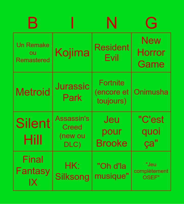 This bingo card has 16 words: HK: Silksong, "C'est quoi ça", Resident Evil, Un Remake ou Remastered, Silent Hill, Kojima, Jeu pour Brooke, "Oh d'la musique", Metroid, Jurassic Park, Final Fantasy IX, New Horror Game, Assassin's Creed (new ou DLC), Onimusha, Fortnite (encore et toujours) and "Jeu complètement OSEF".