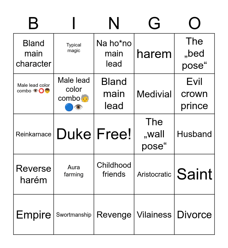 This bingo card has a free space and 24 words: Aura farming, Swortmanship, Bland main lead, Empire, The „bed pose“, Bland main character, Male lead color combo 👁️⭕👦, Typical magic, The „wall pose“, Childhood friends, Medivial, Reinkarnace, Aristocratic, Saint, Male lead color combo🧓🔵👁️, Vilainess, Husband, Na ho*no main lead, Evil crown prince, Duke, Divorce, Reverse harém, harem and Revenge.