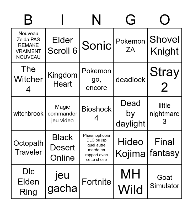 This bingo card has a free space and 24 words: Black Desert Online, jeu gacha, Pokemon go, encore, Dlc Elden Ring, Shovel Knight, Nouveau Zelda PAS REMAKE VRAIMENT NOUVEAU, The Witcher 4, Elder Scroll 6, Dead by daylight, Phasmophobia DLC ou jsp quel autre merde en rapport avec cette chose, deadlock, witchbrook, Hideo Kojima, Final fantasy, Kingdom Heart, MH Wild, little nightmare 3, Sonic, Stray 2, Magic commander jeu video, Goat Simulator, Octopath Traveler, Pokemon ZA and Fortnite.