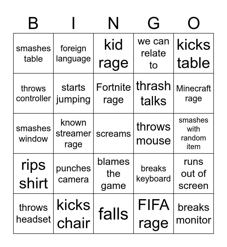 This bingo card has a free space and 24 words: punches camera, kicks chair, Fortnite rage, throws headset, kicks table, smashes table, throws controller, foreign language, throws mouse, blames the game, thrash talks, smashes window, breaks keyboard, runs out of screen, starts jumping, FIFA rage, smashes with random item, kid rage, Minecraft rage, known streamer rage, breaks monitor, rips shirt, we can relate to and falls.