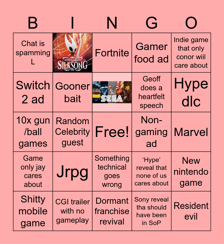 This bingo card has 2 images, a free space and 22 words: Jrpg, CGI trailer with no gameplay, Shitty mobile game, Indie game that only conor wiil care about, Chat is spamming L, Switch 2 ad, Non- gaming ad, Something technical goes wrong, Geoff does a heartfelt speech, 10x gun /ball games, ‘Hype’ reveal that none of us cares about, New nintendo game, Gooner bait, Sony reveal tha should have been in SoP, Marvel, Fortnite, Hype dlc, Random Celebrity guest, Resident evil, Game only jay cares about, Gamer food ad and Dormant franchise revival.