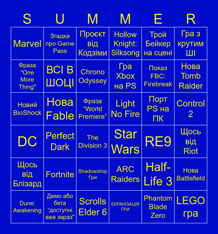 This bingo card has 36 words: ARC Raiders, Shadowdrop Гри, ЕКРАНІЗАЦІЯ ГРИ, Фраза "One More Thing", DC, Light No Fire, ВСІ В ШОЦІ, Scrolls Elder 6, Трой Бейкер на сцені, Half-Life 3, Нова Tomb Raider, Hollow Knight: Silksong, Нова Battlefield, Нова Fable, Гра Xbox на PS, Marvel, Щось від Блізард, Порт PS на ПК, Новий BioShock, Проєкт від Кодзіми, Фраза “World Premiere”, Perfect Dark, Star Wars, The Division 3, RE9, Згадка про Game Pass, Показ FBC: Firebreak, Демо або бета “доступні вже зараз", Chrono Odyssey, Гра з крутим ШІ, LEGO гра, Dune: Awakening, Щось від Riot, Control 2, Fortnite and Phantom Blade Zero.