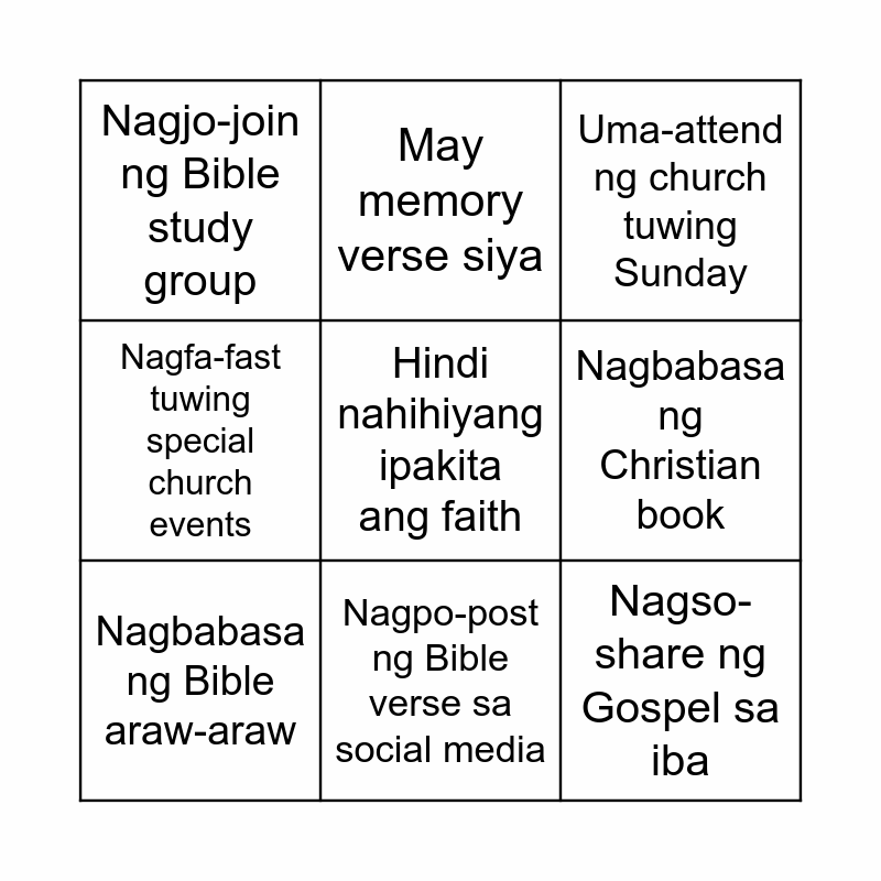 This bingo card has 20 words: Nagbabasa ng Bible araw-araw, Nagpe-pray bago kumain, Uma-attend ng church tuwing Sunday, Nagsu-serve sa ministry, Nagwo-worship through songs, Nagso-share ng Gospel sa iba, Nagsusuot ng Christian shirt, May memory verse siya, Nagti-tithes or nag-o-offering, Nagjo-join ng Bible study group, Nagpo-post ng Bible verse sa social media, May prayer journal, Nagfa-fast tuwing special church events, Sumasama sa outreach or mission, Nagpapatawad kahit mahirap, Nagpapakita ng love and kindness, Hindi nahihiyang ipakita ang faith, Nagbabasa ng Christian book, Sumasali sa youth fellowship and May Christian playlist sa phone niya.