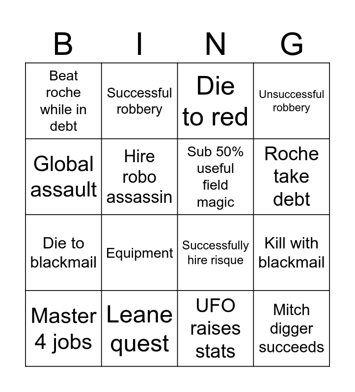 This bingo card has 16 words: Leane quest, Kill with blackmail, Die to red, Beat roche while in debt, Die to blackmail, Successful robbery, Successfully hire risque, UFO raises stats, Global assault, Hire robo assassin, Master 4 jobs, Unsuccessful robbery, Equipment, Roche take debt, Sub 50% useful field magic and Mitch digger succeeds.