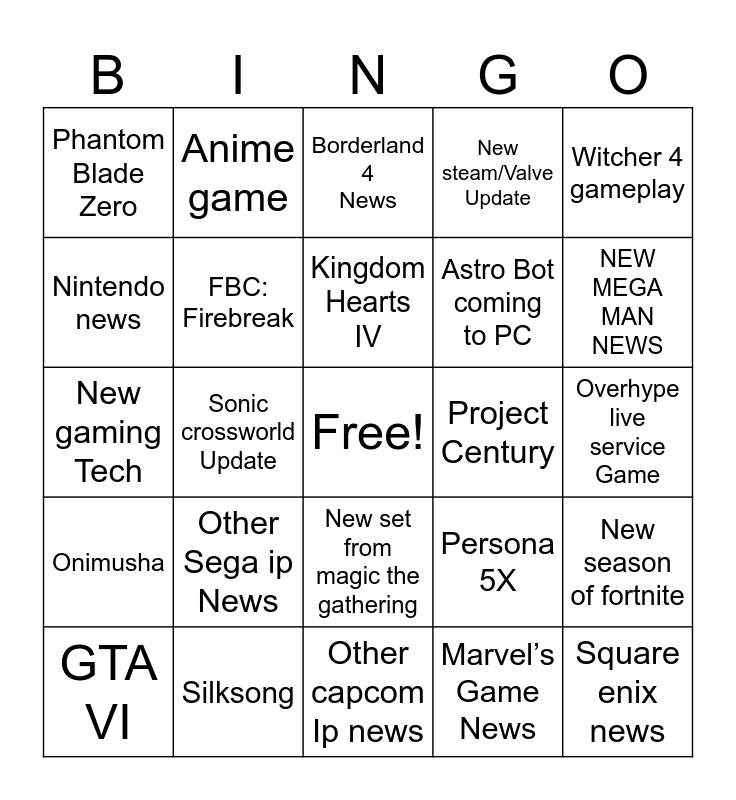 This bingo card has a free space and 24 words: Other Sega ip News, Silksong, Kingdom Hearts IV, GTA VI, Witcher 4 gameplay, Phantom Blade Zero, Nintendo news, Anime game, Project Century, New set from magic the gathering, Astro Bot coming to PC, New gaming Tech, Persona 5X, New season of fortnite, FBC: Firebreak, Marvel’s Game News, Overhype live service Game, Borderland 4 News, NEW MEGA MAN NEWS, Sonic crossworld Update, Square enix news, Onimusha, New steam/Valve Update and Other capcom Ip news.