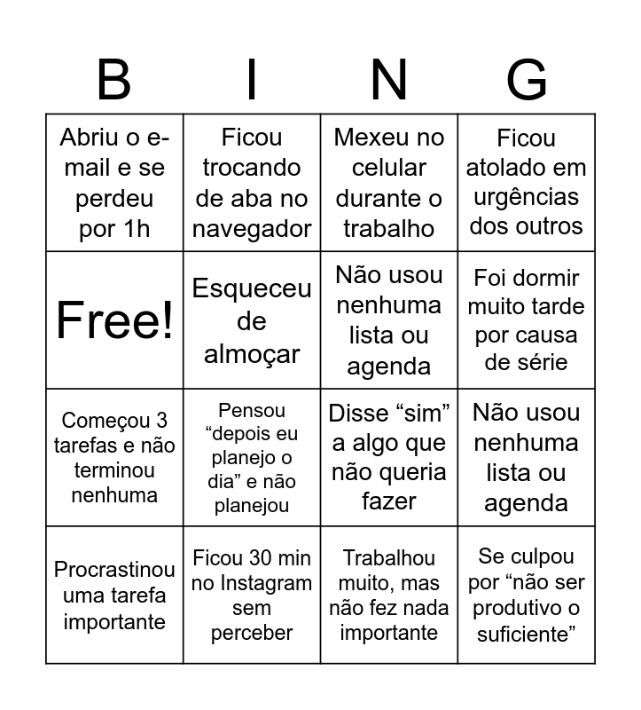 This bingo card has 16 words: Ficou 30 min no Instagram sem perceber, Não usou nenhuma lista ou agenda, Mexeu no celular durante o trabalho, Abriu o e-mail e se perdeu por 1h, Começou 3 tarefas e não terminou nenhuma, Ficou trocando de aba no navegador, Disse “sim” a algo que não queria fazer, Trabalhou muito, mas não fez nada importante, Free!, Esqueceu de almoçar, Procrastinou uma tarefa importante, Ficou atolado em urgências dos outros, Pensou “depois eu planejo o dia” e não planejou, Foi dormir muito tarde por causa de série, Não usou nenhuma lista ou agenda and Se culpou por “não ser produtivo o suficiente”.