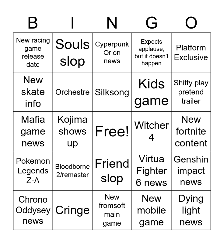This bingo card has a free space and 24 words: Bloodborne 2/remaster, Cringe, Silksong, Chrono Oddysey news, Platform Exclusive, New racing game release date, New skate info, Souls slop, Witcher 4, Friend slop, Kids game, Mafia game news, Virtua Fighter 6 news, Genshin impact news, Orchestre, New mobile game, New fortnite content, Cyperpunk Orion news, Shitty play pretend trailer, Kojima shows up, Dying light news, Pokemon Legends Z-A, Expects applause, but it doesn't happen and New fromsoft main game.