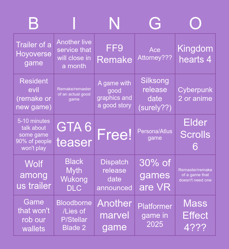 This bingo card has a free space and 24 words: Black Myth Wukong DLC, Bloodborne /Lies of P/Stellar Blade 2, A game with good graphics and a good story, Game that won't rob our wallets, Kingdom hearts 4, Trailer of a Hoyoverse game, Resident evil (remake or new game), Another live service that will close in a month, Persona/Atlus game, Dispatch release date announced, Silksong release date (surely??), 5-10 minutes talk about some game 90% of people won't play, 30% of games are VR, Remaster/remake of a game that doesn't need one, Remake/remaster of an actual good game, Platformer game in 2025, Elder Scrolls 6, FF9 Remake, Cyberpunk 2 or anime, GTA 6 teaser, Mass Effect 4???, Wolf among us trailer, Ace Attorney??? and Another marvel game.