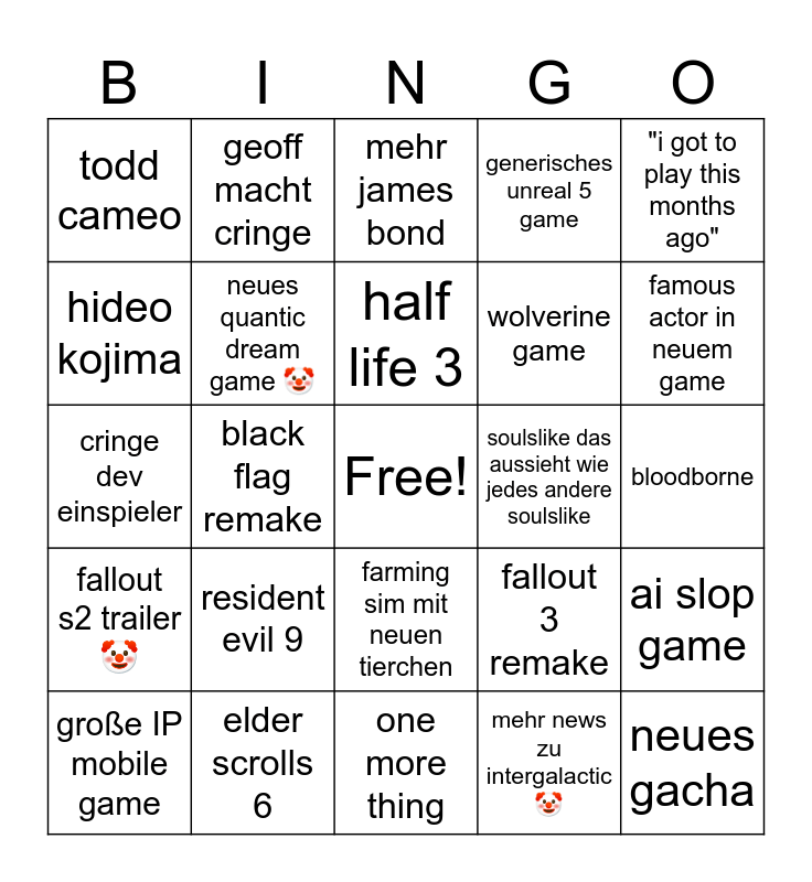 This bingo card has a free space and 24 words: resident evil 9, elder scrolls 6, half life 3, große IP mobile game, "i got to play this months ago", todd cameo, hideo kojima, geoff macht cringe, soulslike das aussieht wie jedes andere soulslike, farming sim mit neuen tierchen, wolverine game, cringe dev einspieler, fallout 3 remake, ai slop game, neues quantic dream game 🤡, mehr news zu intergalactic 🤡, bloodborne, mehr james bond, famous actor in neuem game, black flag remake, neues gacha, fallout s2 trailer 🤡, generisches unreal 5 game and one more thing.