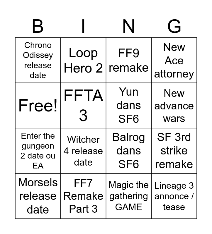 This bingo card has 16 words: FF7 Remake Part 3, SF 3rd strike remake, FF9 remake, Chrono Odissey release date, Enter the gungeon 2 date ou EA, Loop Hero 2, Balrog dans SF6, Magic the gathering GAME, Free!, FFTA 3, Morsels release date, New Ace attorney, Witcher 4 release date, New advance wars, Yun dans SF6 and Lineage 3 annonce / tease.