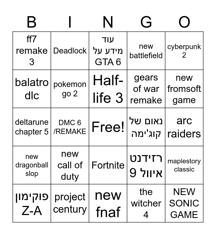 This bingo card has a free space and 24 words: new call of duty, project century, Half-life 3, פוקימון Z-A, cyberpunk 2, ff7 remake 3, balatro dlc, Deadlock, נאום של קוג'ימה, Fortnite, gears of war remake, deltarune chapter 5, רזידנט איוול 9, maplestory classic, pokemon go 2, the witcher 4, arc raiders, עוד מידע על GTA 6, new fromsoft game, DMC 6 /REMAKE, NEW SONIC GAME, new dragonball slop, new battlefield and new fnaf.