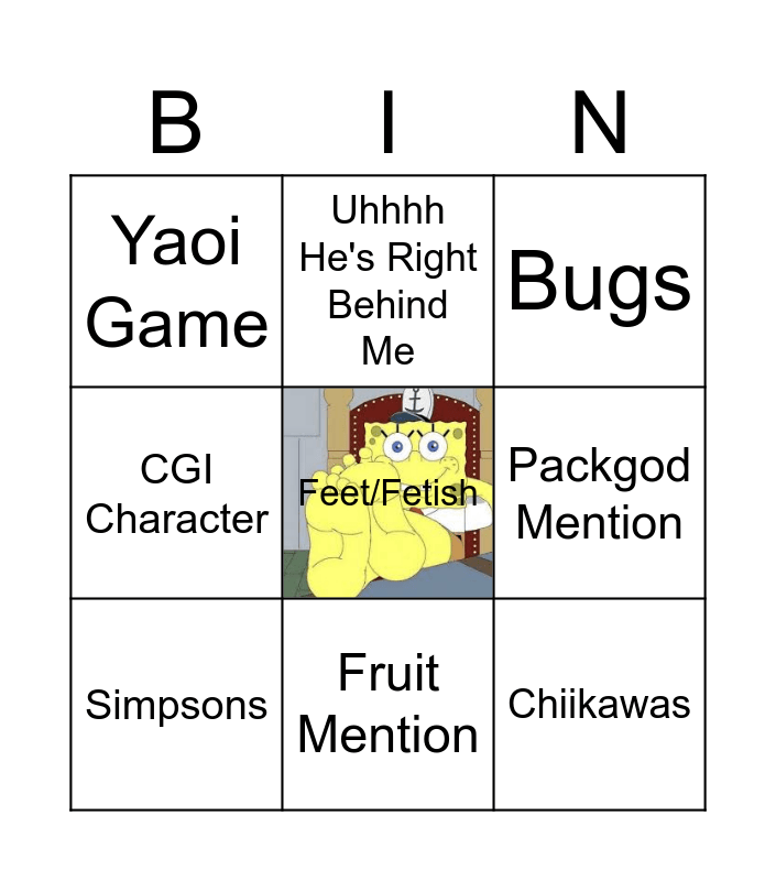 This bingo card has a free space and 8 words: Packgod Mention, Bugs, Uhhhh He's Right Behind Me, Simpsons, Yaoi Game, Chiikawas, CGI Character and Fruit Mention.