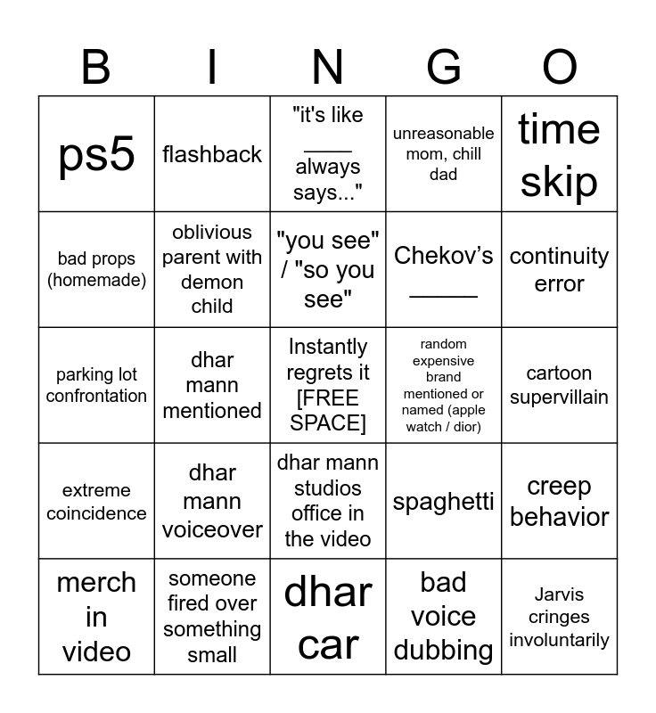 This bingo card has a free space and 25 words: dhar mann voiceover, dhar car, "you see" / "so you see", merch in video, time skip, ps5, bad props (homemade), flashback, random expensive brand mentioned or named (apple watch / dior), dhar mann studios office in the video, Chekov’s _____, parking lot confrontation, spaghetti, creep behavior, oblivious parent with demon child, kids with ipad, cartoon supervillain, "it's like ____ always says...", continuity error, dhar mann mentioned, Jarvis cringes involuntarily, someone fired over something small, extreme coincidence, unreasonable mom, chill dad and bad voice dubbing.